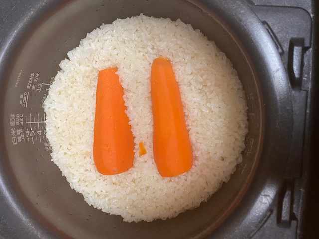 洗ったお米にツナ缶のオイルとめんつゆを入れ、皮をむいたニンジンをのっけて炊きます。