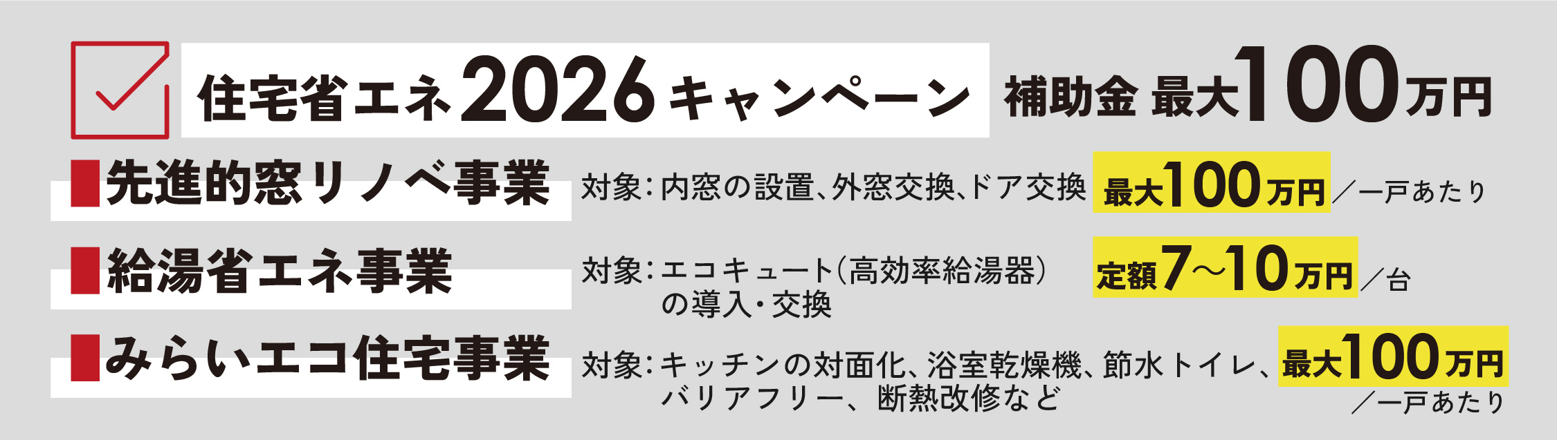 今知っておきたい【2026年 住宅省エネ補助金】についても解説。 窓リフォームやエコキュートの設置で、想像以上におトクにリフォームができるチャンスです。