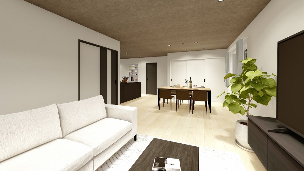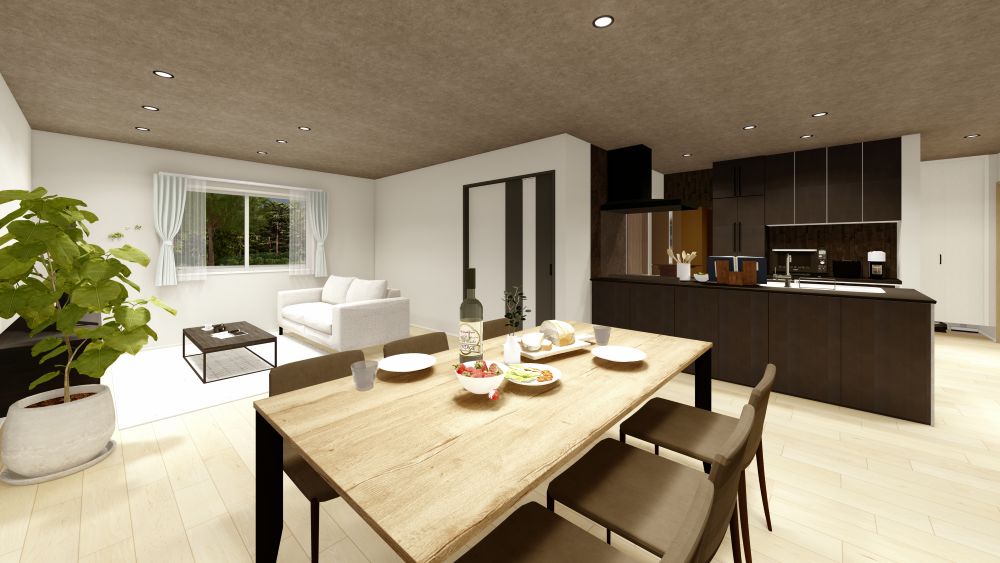 ▲リビング・ダイニング・キッチンを一体にしながらも、程よい距離感で落ち着いて過ごせます