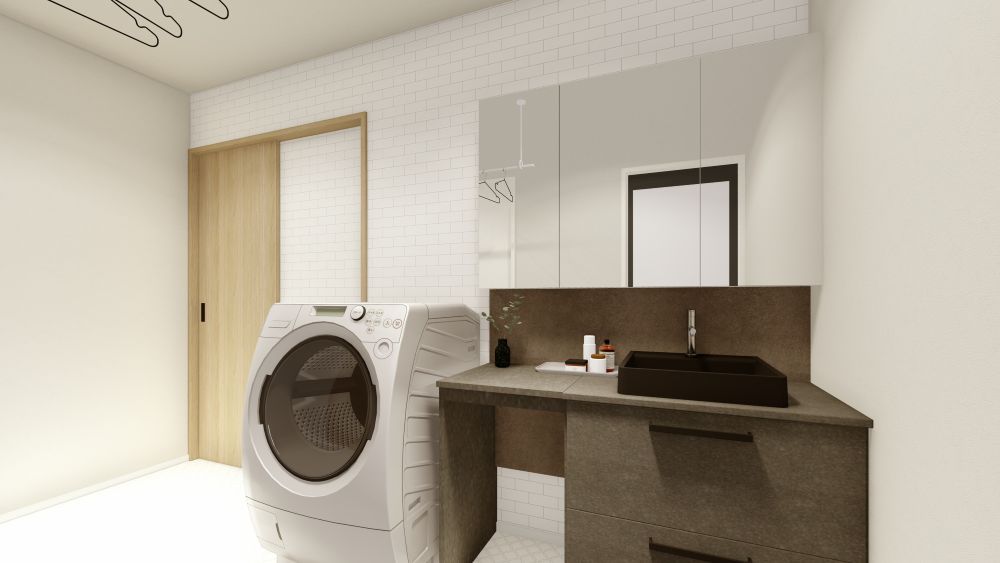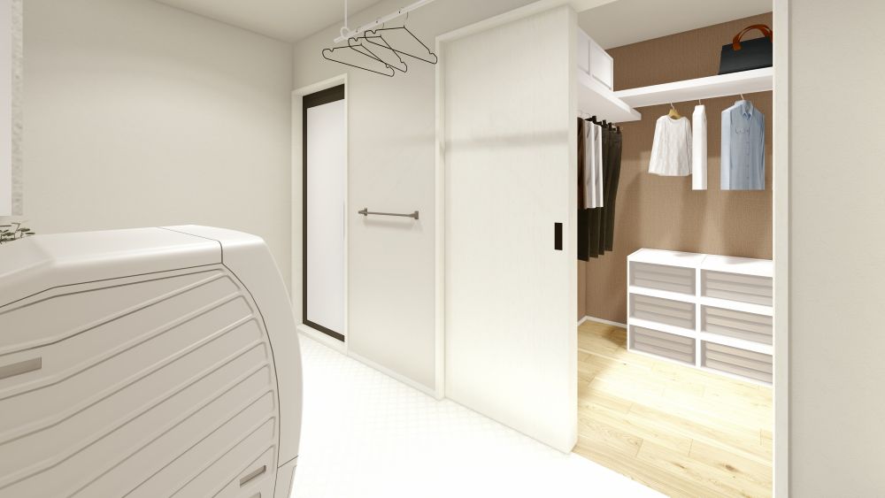 ▲ランドリーからファミリークローゼット、主寝室までをスムーズにつなぎ、家事も身支度も無駄なく完結できる動線