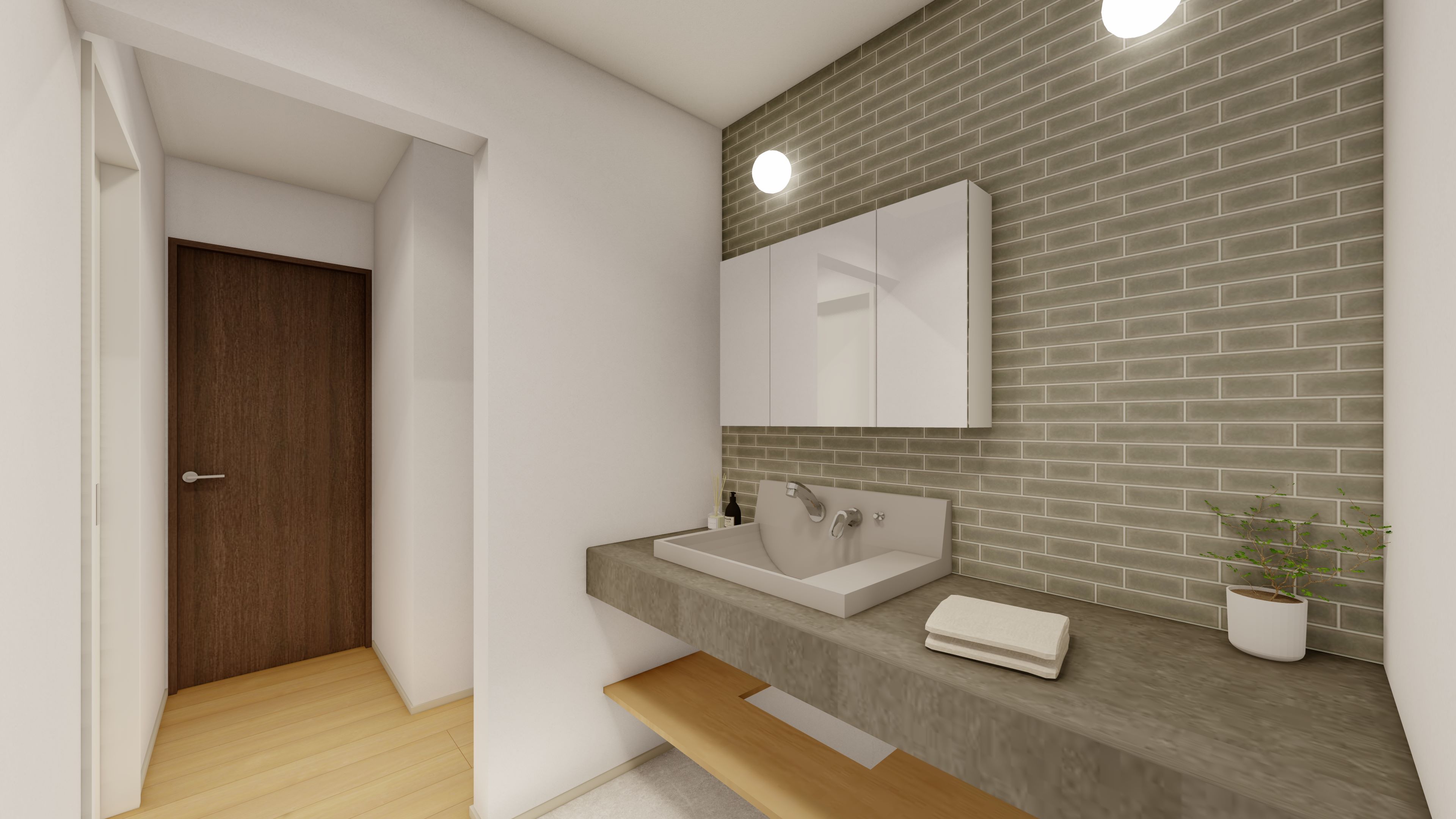 ▲タイル柄のアクセントクロスが映える上質な洗面ルーム
