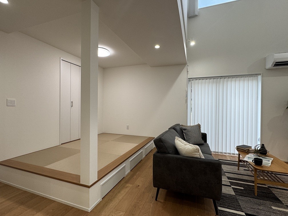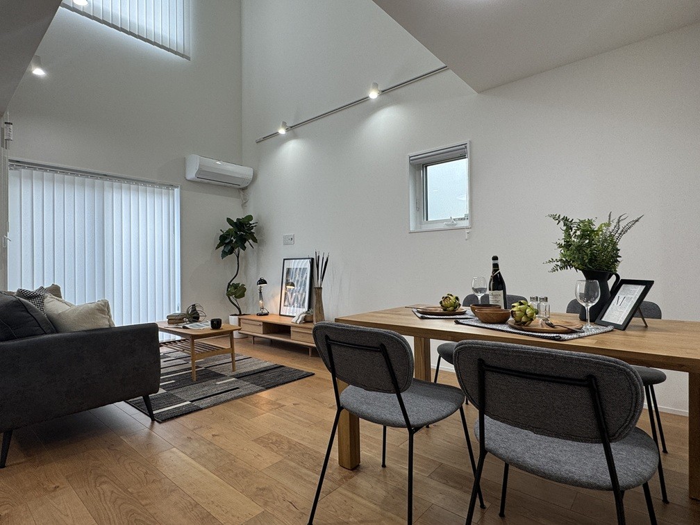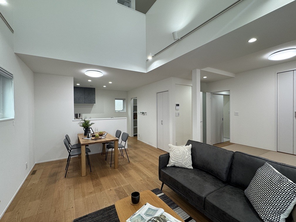 ▲大きな吹抜けが印象的な17帖+3帖の畳コーナーがあるLDK