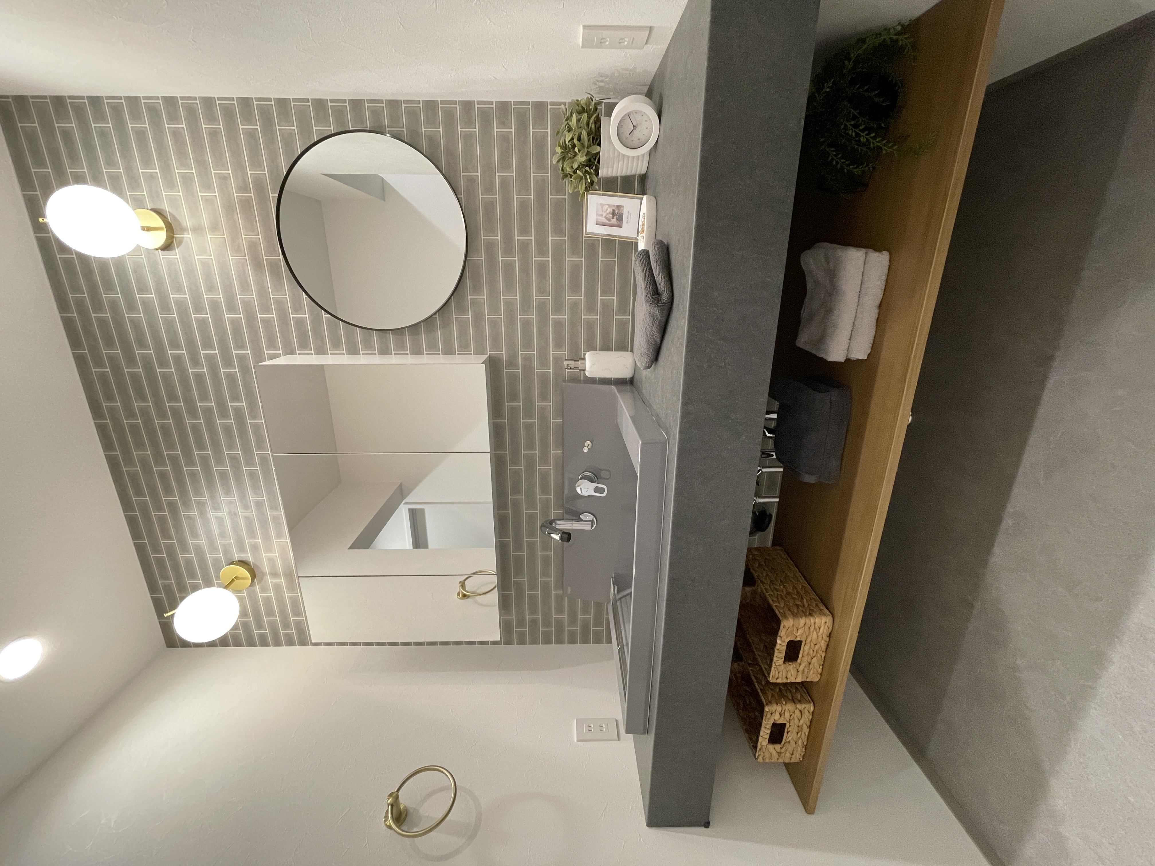 ▲タイル柄のアクセントクロスが映える上質な洗面ルーム