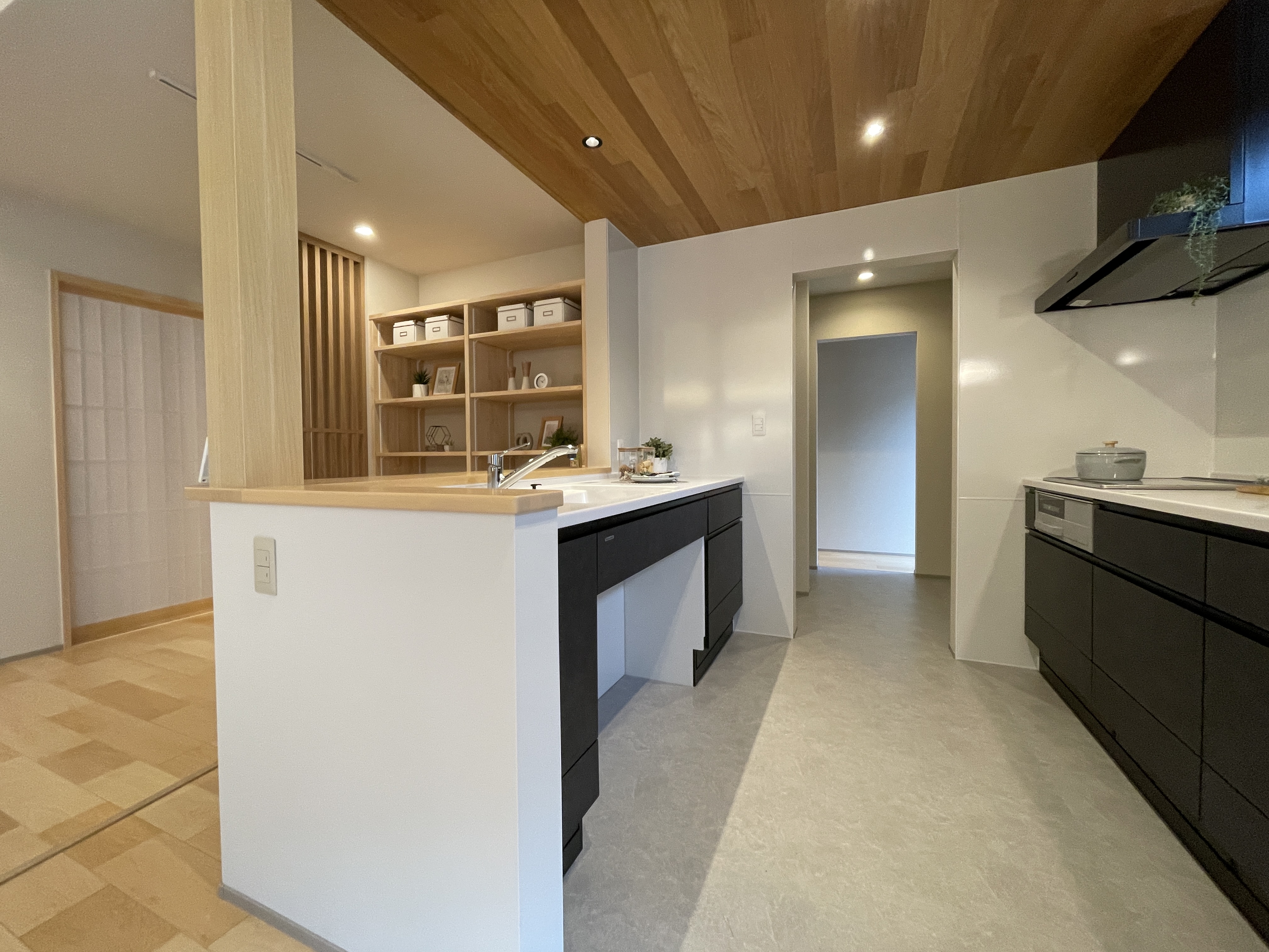 キッチンエリアは木目の折下げ天井と腰壁によって「囲む」設計に。落ち着きと安心感をもたらしてくれます。