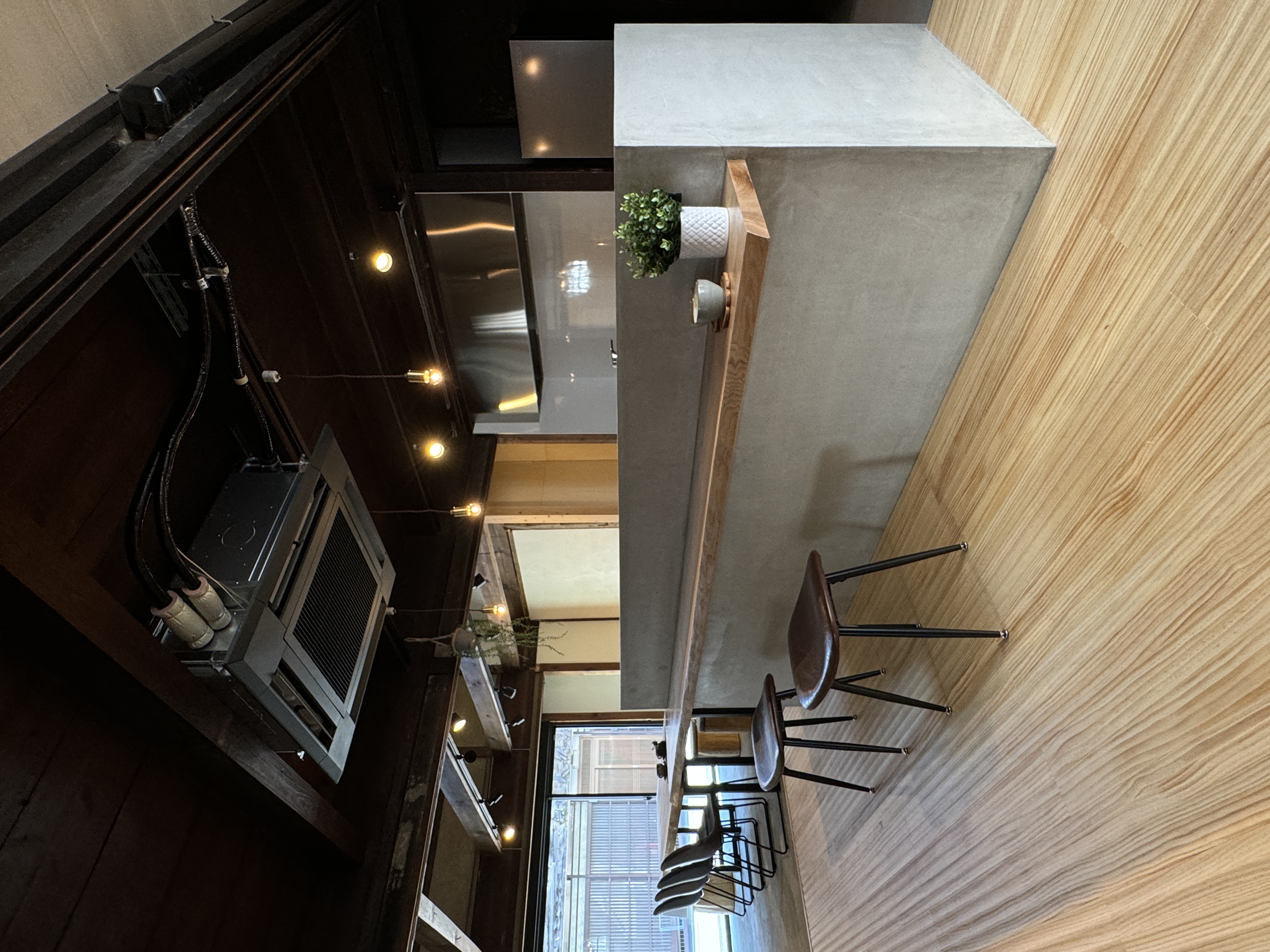 モルタルの無機質な風合いと木のカウンターの組み合わせがお洒落です