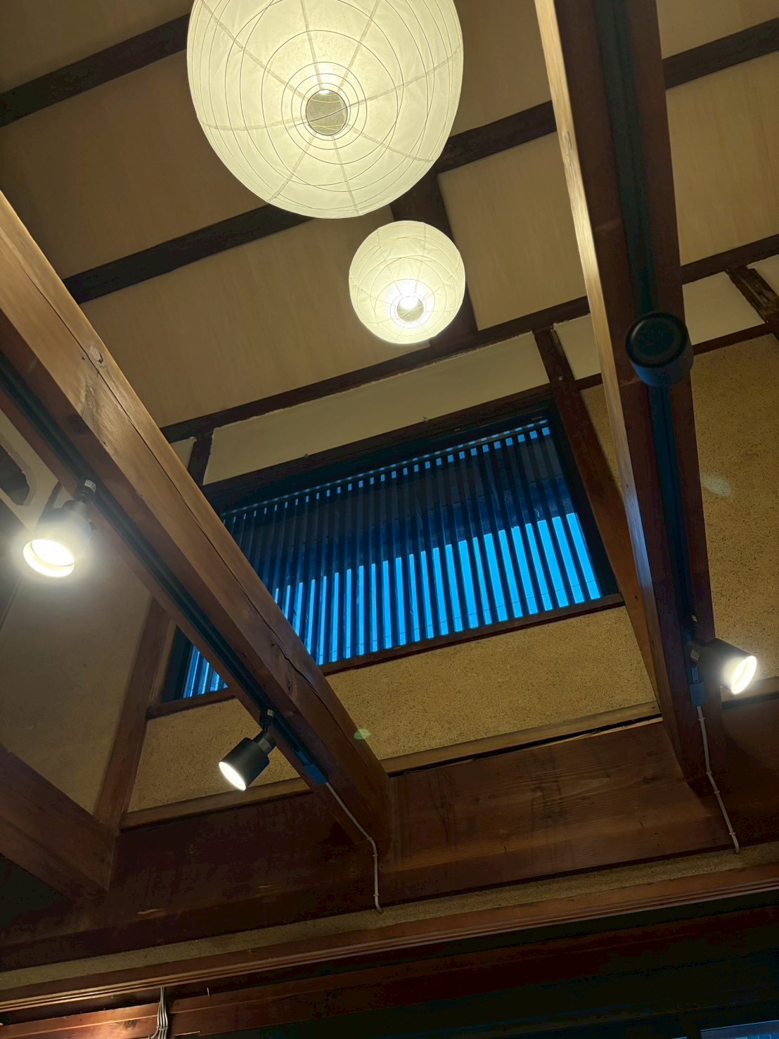 ▲吹抜けと和紙シェードの灯りがこの古民家のシンボリックなイメージとなっています。