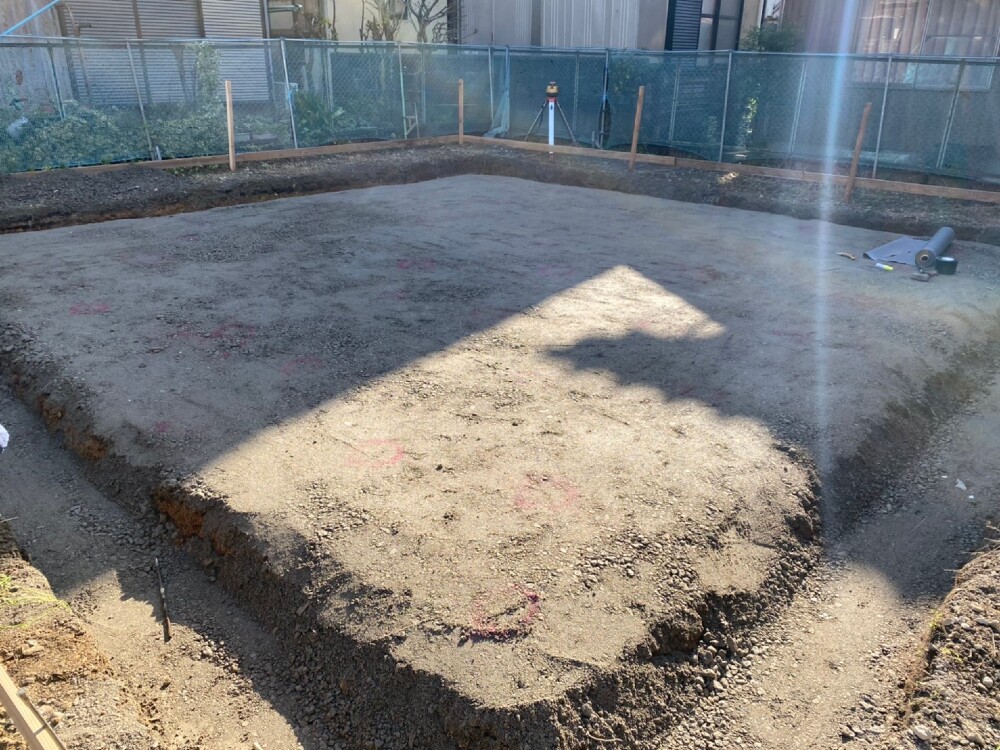 丁張りというお家の位置出しをしまして、地面の掘削・砕石投入・転圧、そのあとお預かりしてました鎮物を配置させていただき土間シートを敷き外周部分にコンクリートを打設しました。