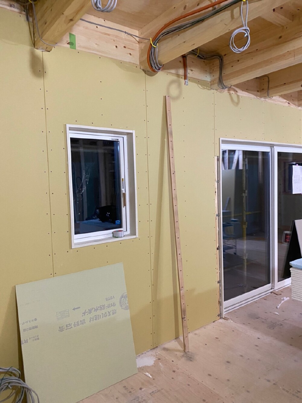 本日は、1階の建具枠取り付けとボード張りを進めていただきました。