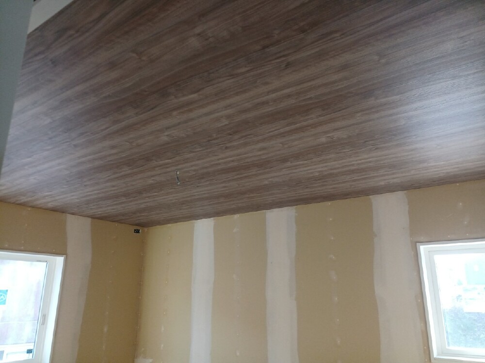 天井下地の完了したところから、天井ボードを張っております。