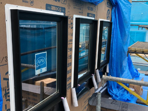 搬入されたサッシの取付を進めております。