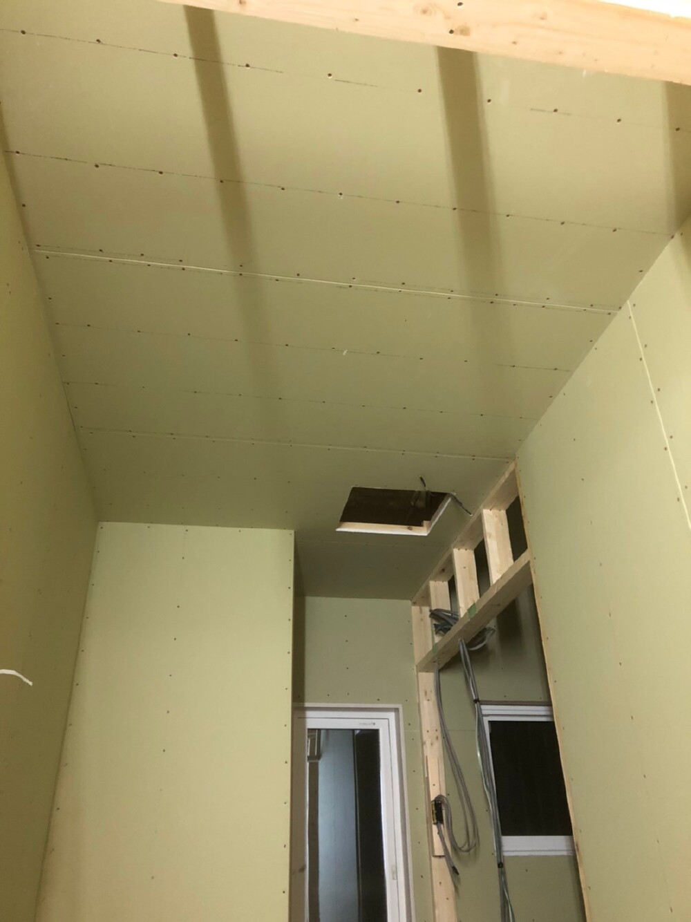 天井ボードの施工が終わり、壁ボードの施行をしていただいております