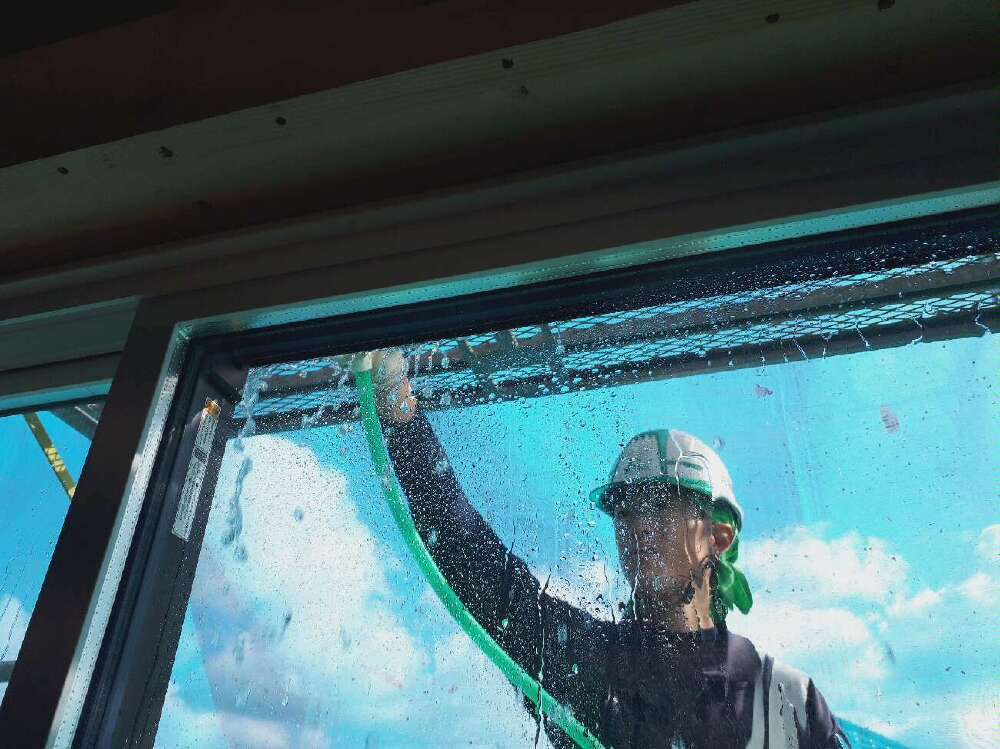 内部足場の撤去前に、吹き抜け部分の窓や化粧梁の美装をしていただきました!