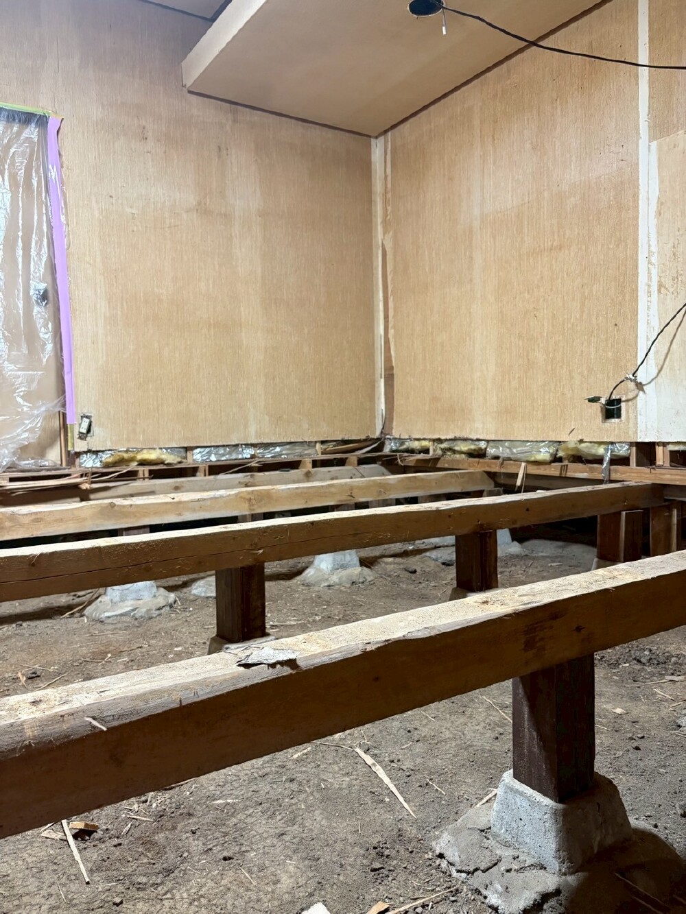 リビング根太取付、床下断熱材取付、床下地コンパネ取付を行いました🔨