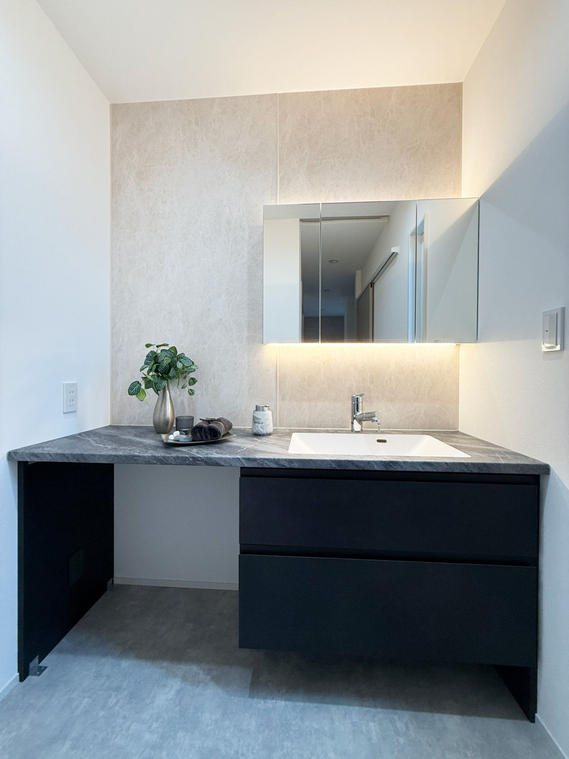 石目調カウンターと間接照明がつくる、上質な洗面スペース。