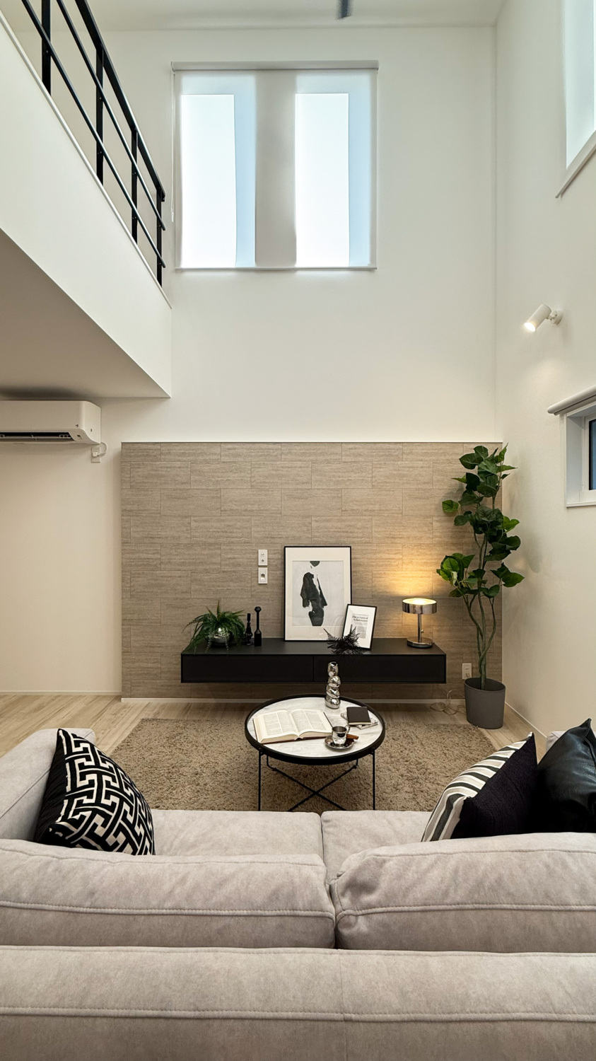 高い吹き抜けから降り注ぐ光が、リビング全体を優しく包み込みます。