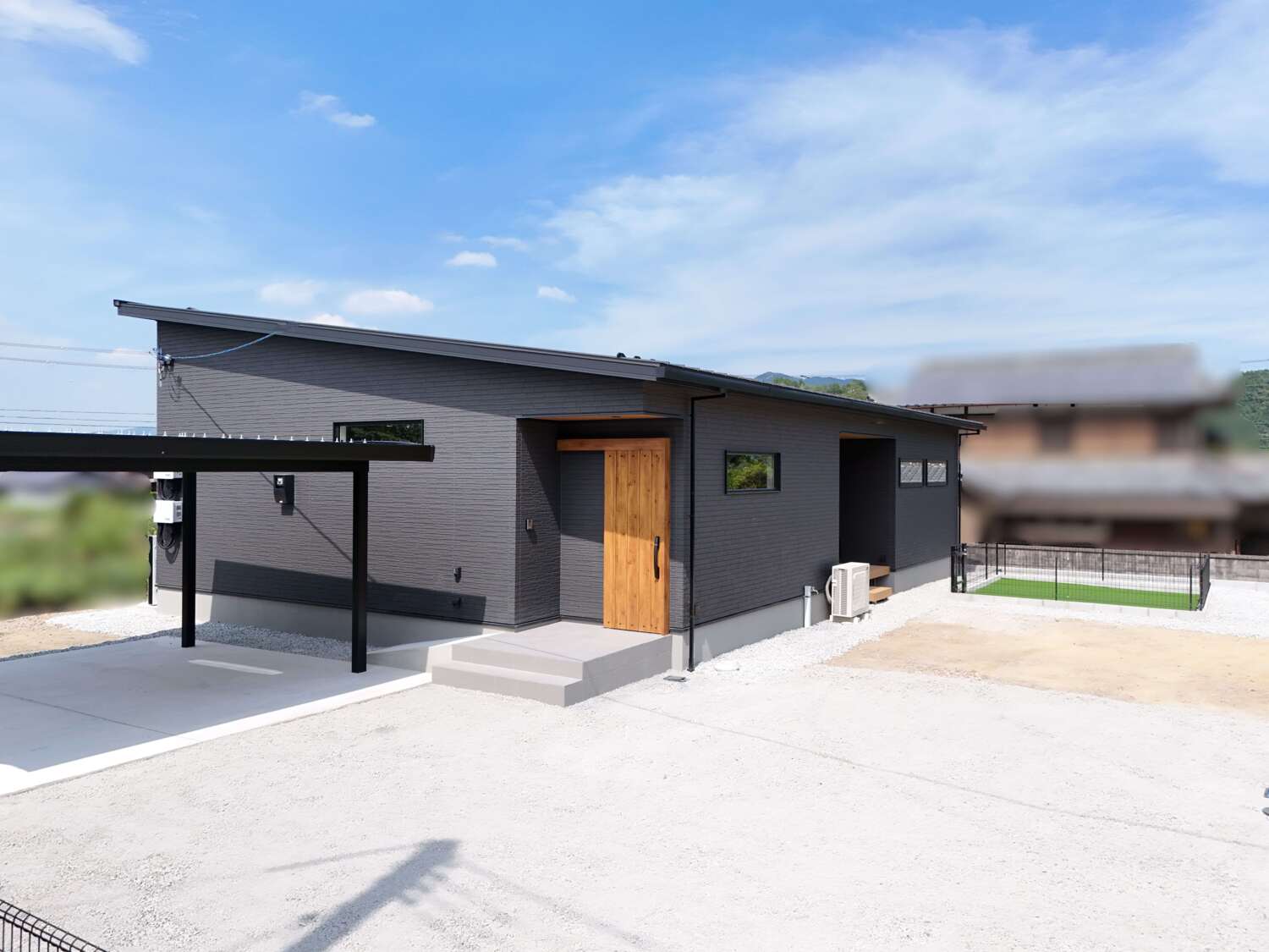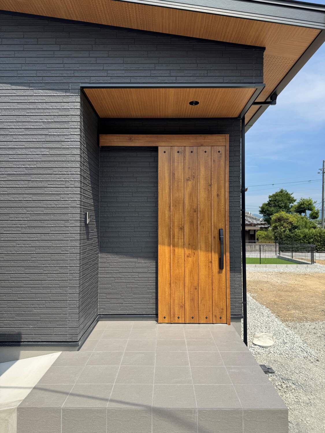 ブラック色基調の外観に、あたたかみのある木目のドアを合わせた落ち着きのある佇まいの外観。