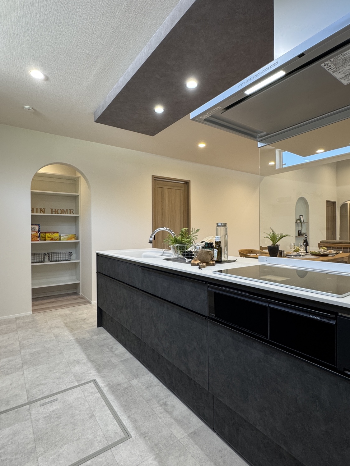 キッチンまわりはグレー×ブラックで落ち着いたコーディネート。