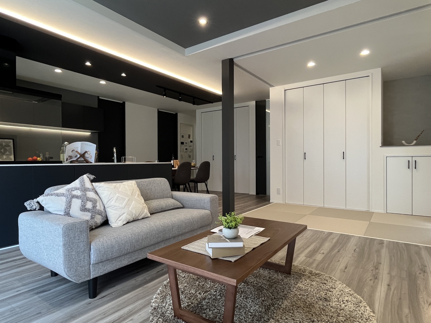 間接照明が彩る上質な空間とグレイッシュカラーが映えるコーディネートにこだわりました。