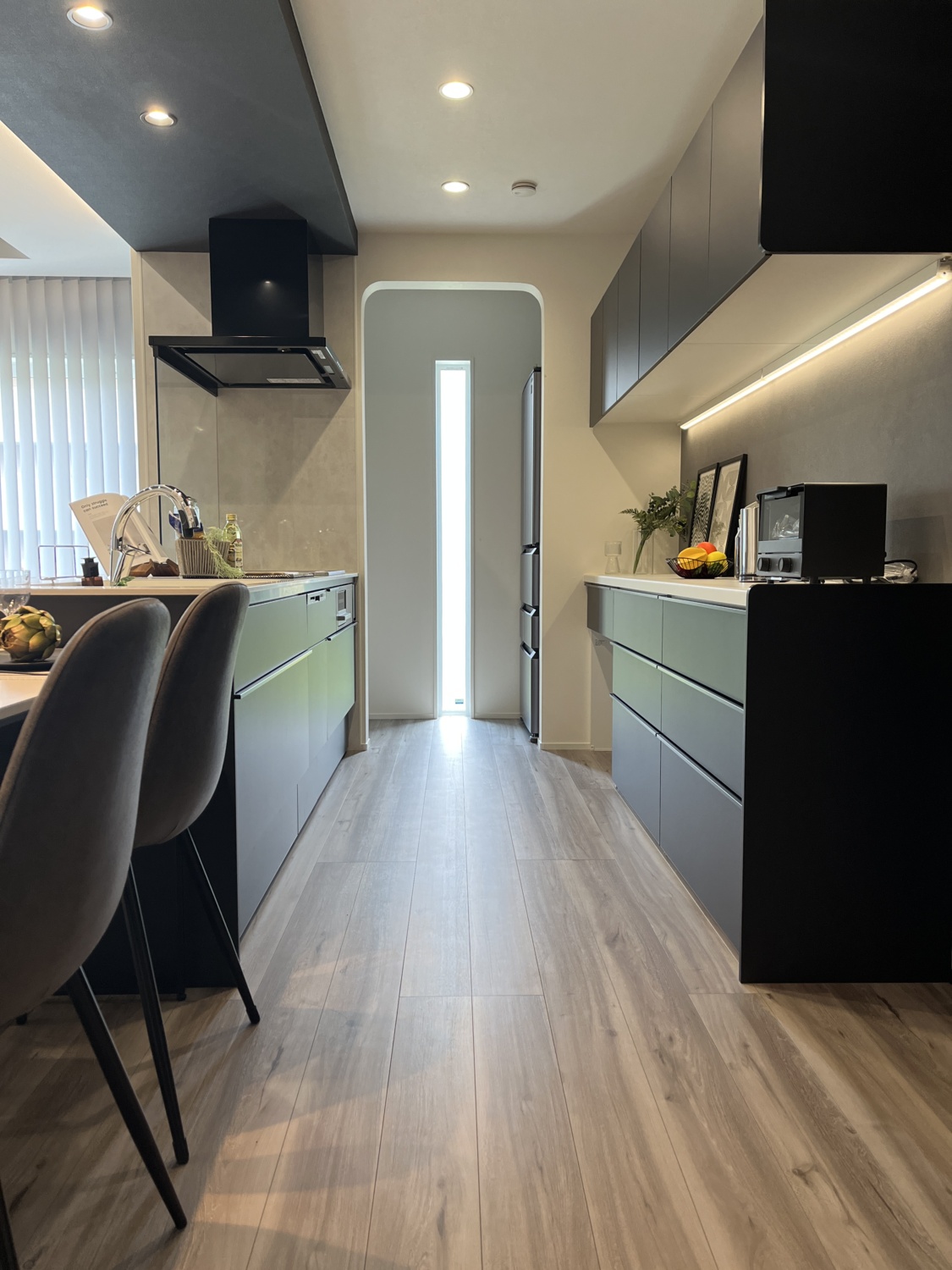 パントリー内に配置した縦スリット窓からは足元まで光が差し込み、明るいキッチンスペースになりました。