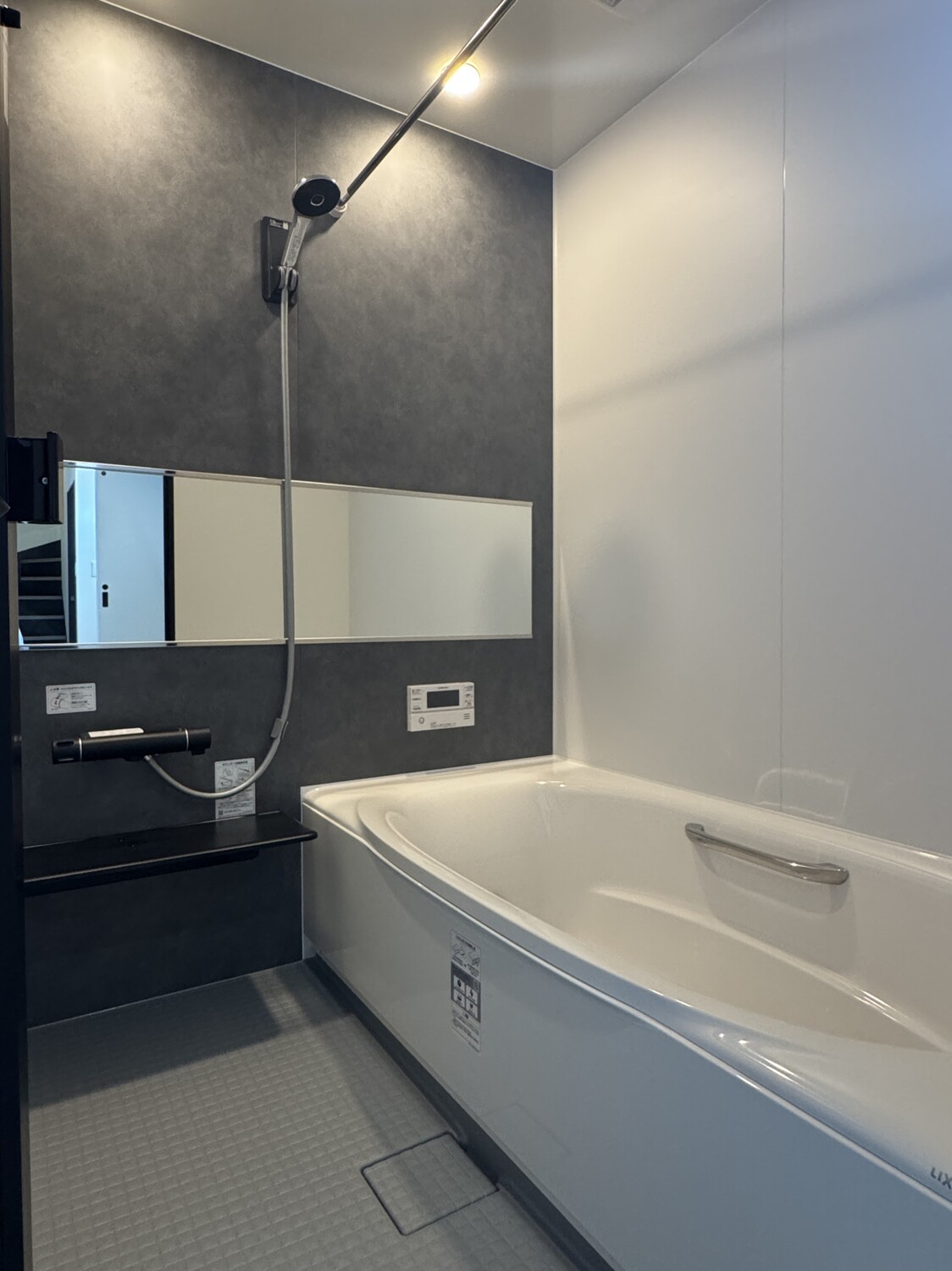 浴室はマットな質感がオシャレなアクセントパネルを貼り、