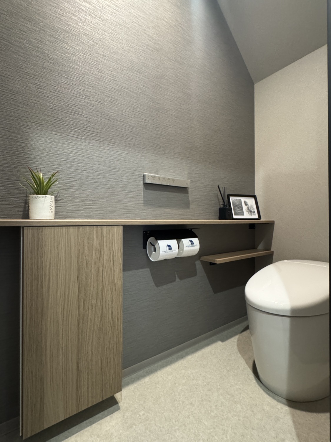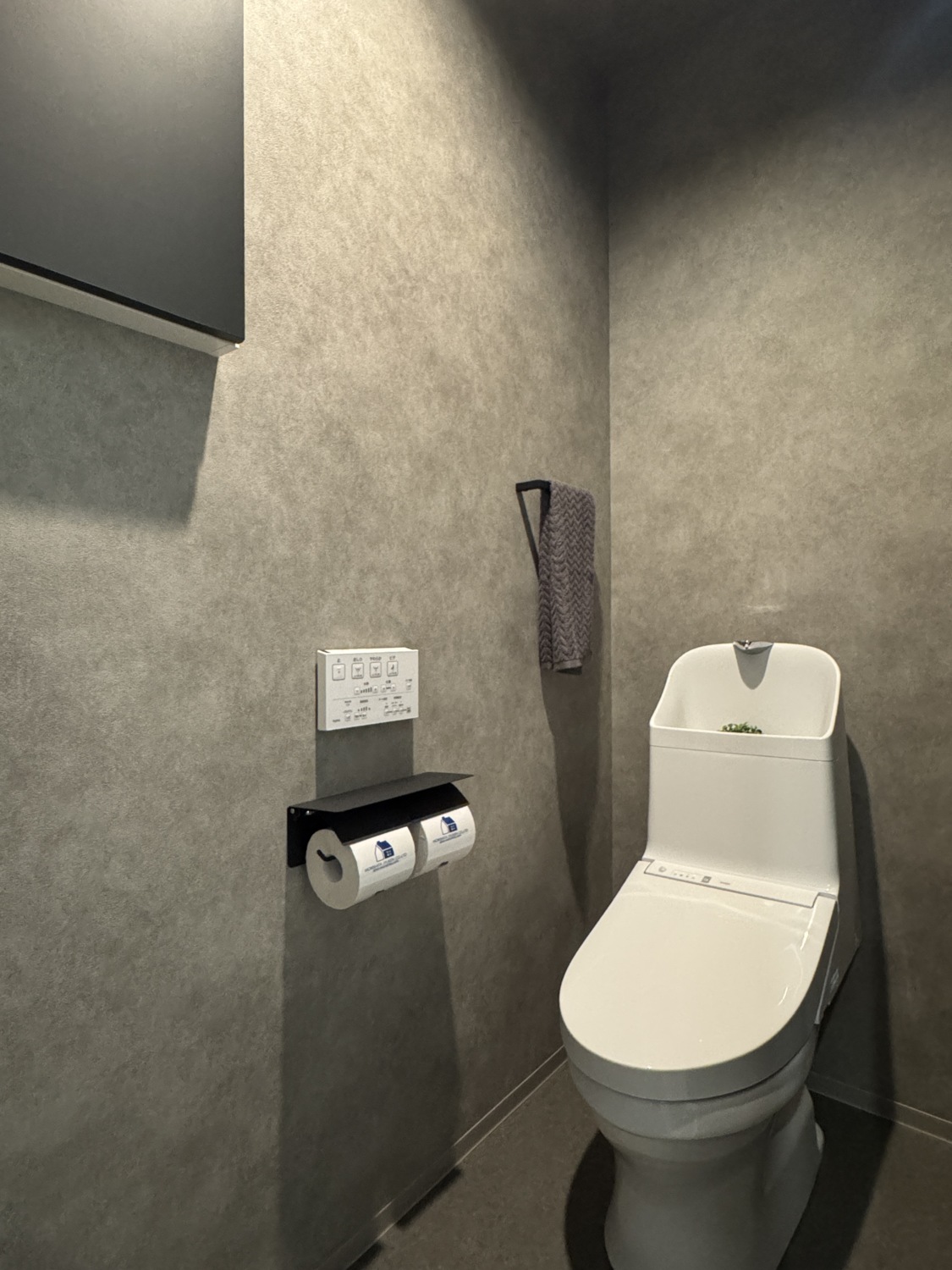 2Fトイレはコンクリート表層を再現した無地の壁紙で統一。