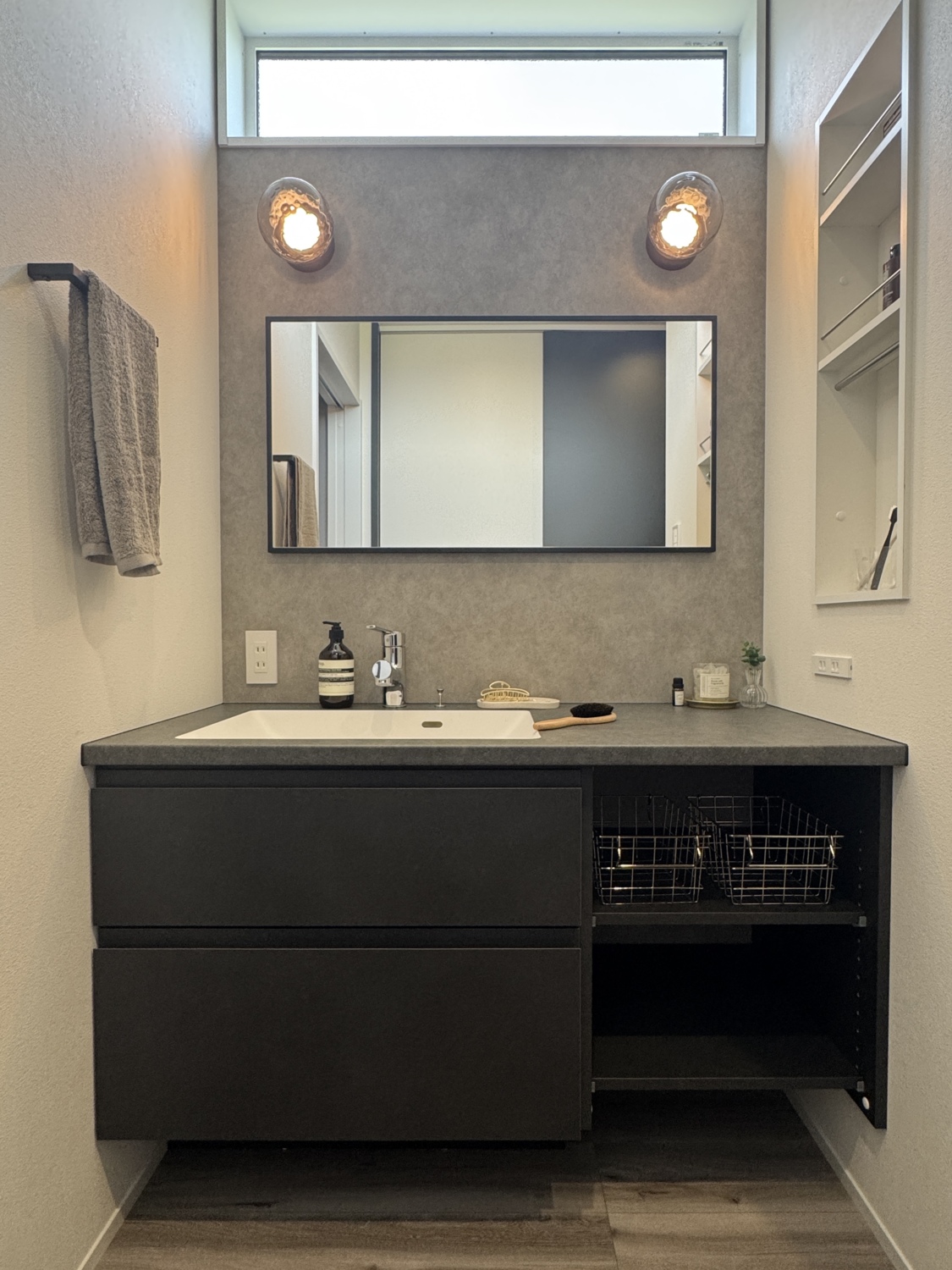 洗面ルームは自然光を取り入れながら、視線が入らないハイサイドライト(高窓)を採用。