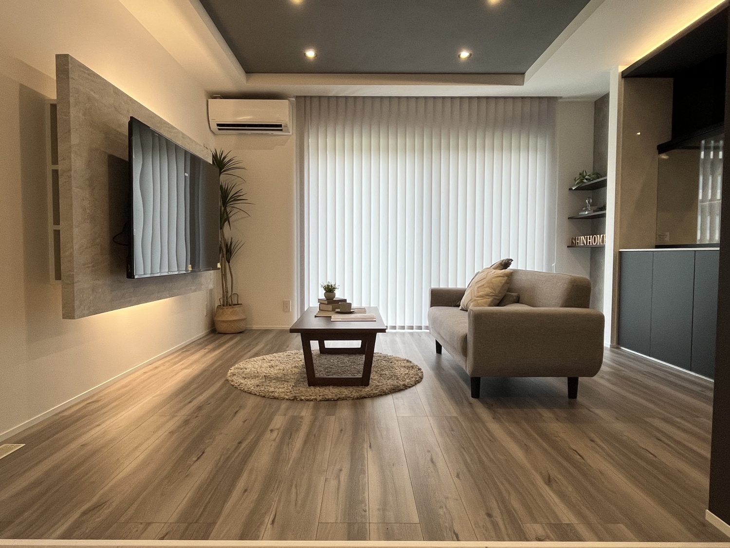 TV背面のふかし壁に間接照明を設け、空間に奥行と立体感を演出しました。