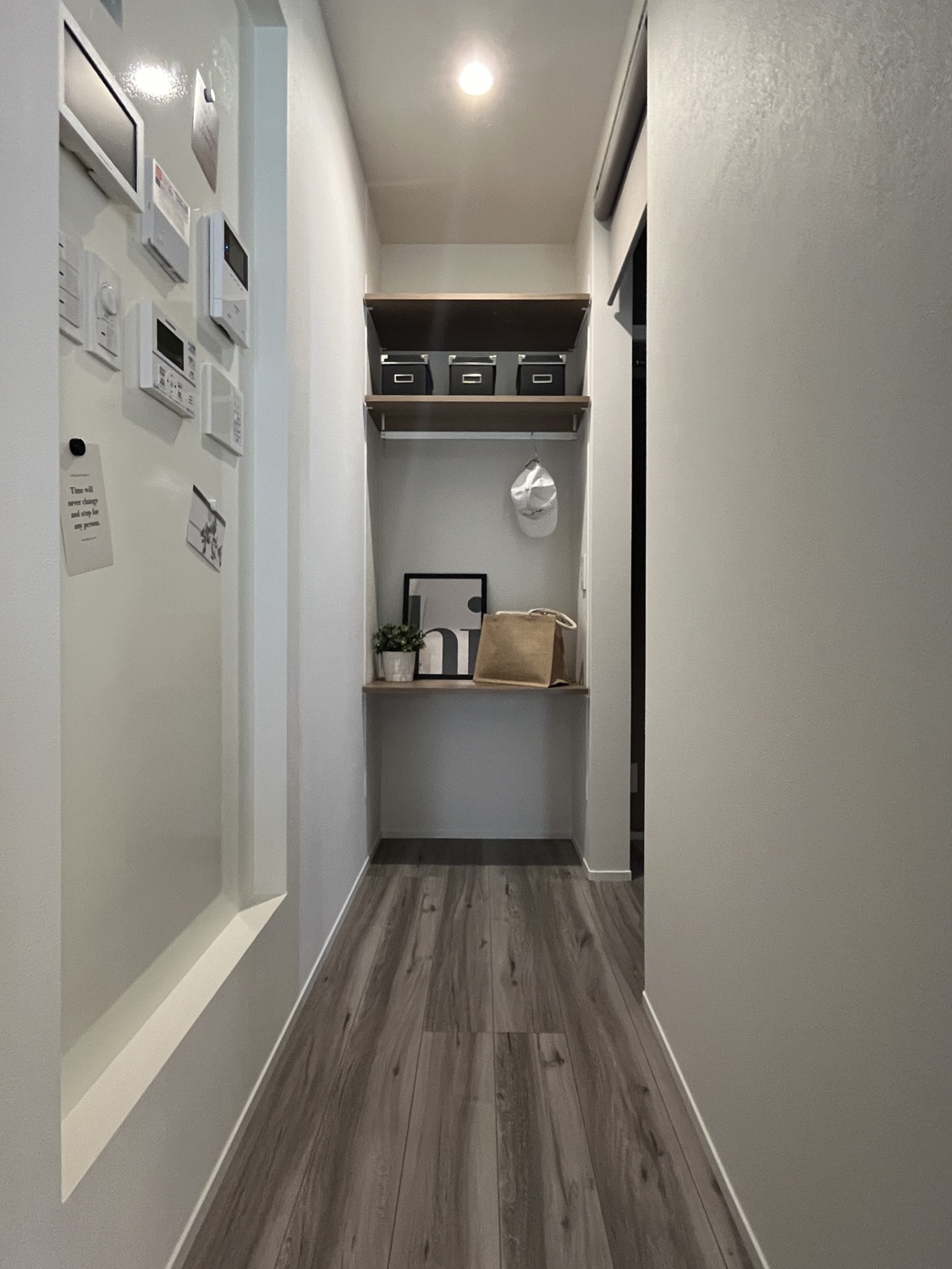 LDKまでの壁面にはマグネットボードを貼ったリモコンニッチを造作。