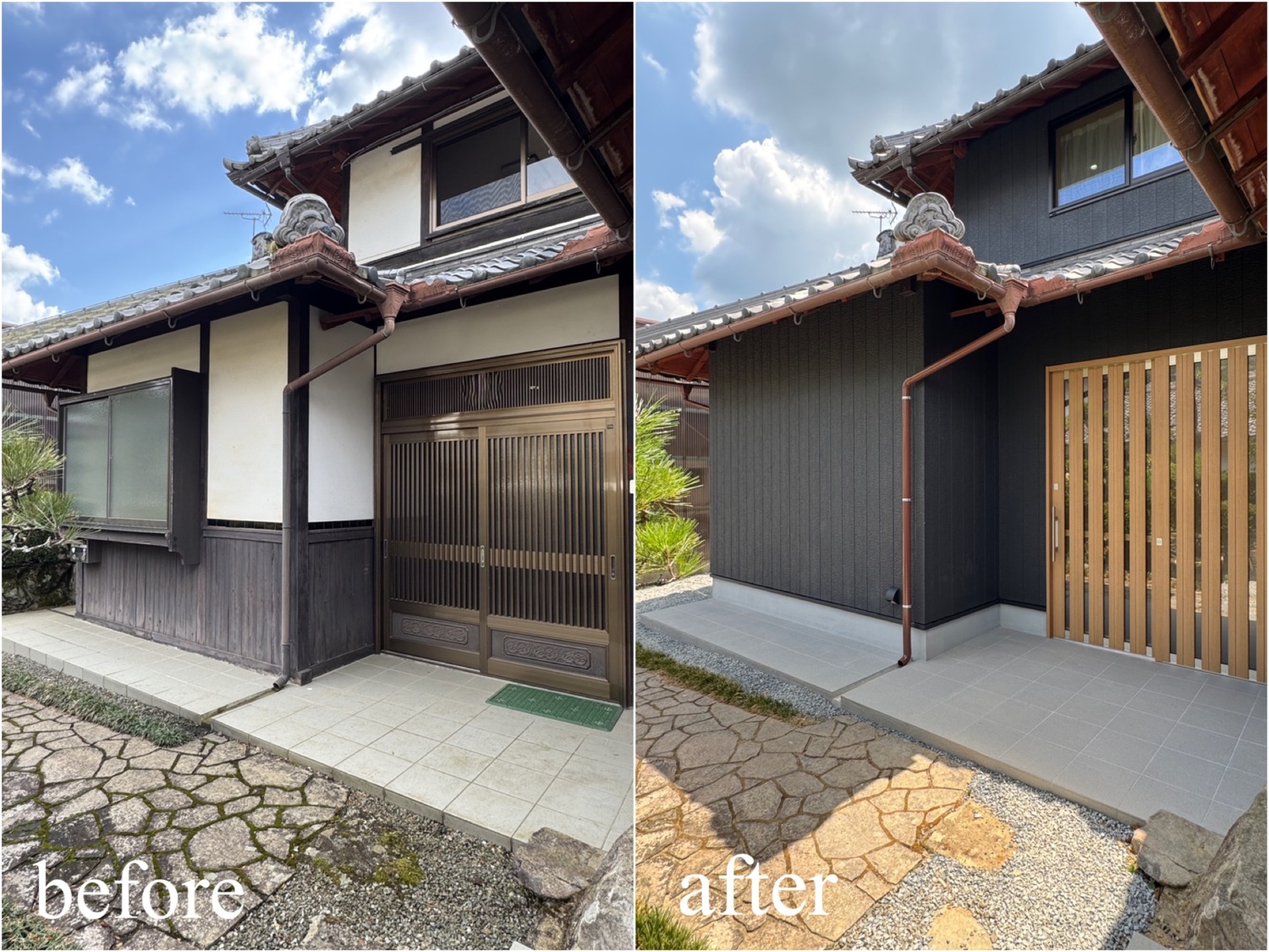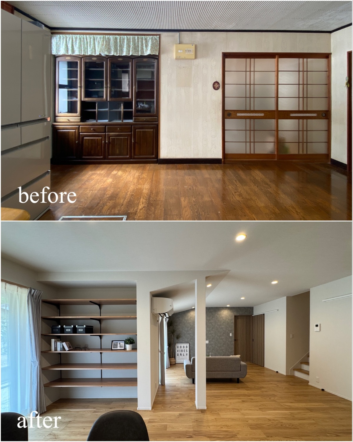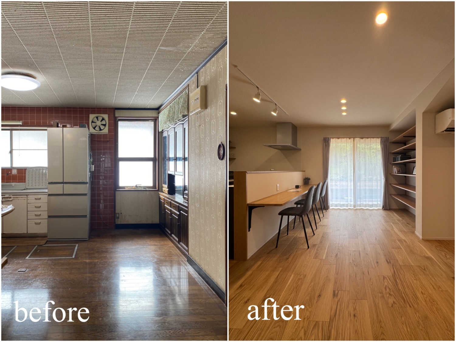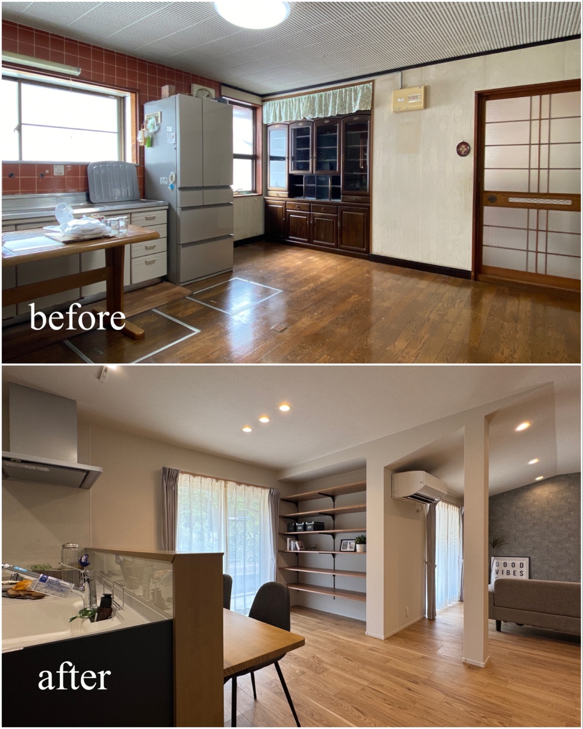 ホーム フォトギャラリー すべて すべて 想いを残して、暮らしをアップデート。築60年のお家をフルリノベーション! 想いを残して、暮らしをアップデート。築60年のお家をフルリノベーション! 丹波市 O様邸リノベーション すべて|すべて 屋根瓦や庭木、石垣など既存の和の魅力は活かしながら、外壁をリフレッシュ。 時を重ねた住まいに、新たな表情を与えました。 外壁:KMEW ネオロック光セラ18 焼杉調 深炭 マックスチタンブラック画像のみを表示全 22 枚中 1 枚目を表示Next ≫ 縦格子の建具が印象的な、落ち着きと上質感のある玄関空間。 素材の風合いを生かしつつ、住まいの「顔」を整えました。 外壁:KMEW ネオロック光セラ18 焼杉調 深炭 マックスチタンブラック 玄関ドア:YKKap れん樹 C03 ハニーチェリー画像のみを表示全 22 枚中 2 枚目を表示≪ Prev|Next ≫ 帰ってきた瞬間にほっとできる、あたたかみのある玄関に。 暮らしに寄り添う空間づくりを大切に クロス:シンコール 天井/BA7206 壁/BA7157 床材:朝日ウッドテック ライブナチュラル MRX イーコア オーク2P ポーチタイル:アドヴァン コルト ライトグレー画像のみを表示全 22 枚中 3 枚目を表示≪ Prev|Next ≫ 暗くなりがちだった玄関もここまで明るく生まれ変わります。 和の雰囲気は残しつつ、現代的な玄関に。 玄関ドア:YKKap れん樹 C03 ハニーチェリー クロス:シンコール 天井/BA7206 壁/BA7157 床材:朝日ウッドテック ライブナチュラル MRX イーコア オーク2P ポーチタイル:アドヴァン コルト ライトグレー画像のみを表示全 22 枚中 4 枚目を表示≪ Prev|Next ≫ 2way動線はそのままに、フロア・クロス・タイルを入れ替え明るい玄関スペースに。 クロス:シンコール 天井/BA7206 壁/BA7157 床材:朝日ウッドテック ライブナチュラル MRX イーコア オーク2P ポーチタイル:アドヴァン コルト ライトグレー画像のみを表示全 22 枚中 5 枚目を表示≪ Prev|Next ≫ 以前は閉鎖的だったキッチン空間は、LDK全体が見渡せる対面キッチンに配置を変更。 家族との会話もはずみますね♪ クロス:シンコール 天井・壁/BA7067 アクセント/BA7225 床材:朝日ウッドテック ライブナチュラル MRX イーコア オーク2P カウンター:造作画像のみを表示全 22 枚中 6 枚目を表示≪ Prev|Next ≫ 居間とダイニングキッチンを繋げて、20帖の大空間LDKに! クロス:シンコール 天井・壁/BA7067 アクセント/BA7237 床材:朝日ウッドテック ライブナチュラル MRX イーコア オーク2P 棚:造作 ウッドワン仕上げている棚板 ライトクリア 画像のみを表示全 22 枚中 7 枚目を表示≪ Prev|Next ≫ クロスはホワイトを基調にし、明るく開放的な空間に生まれ変わりました。 クロス:シンコール 天井・壁/BA7067 アクセント/BA7237 床材:朝日ウッドテック ライブナチュラル MRX イーコア オーク2P 棚:造作 ウッドワン仕上げている棚板 ライトクリア画像のみを表示全 22 枚中 8 枚目を表示≪ Prev|Next ≫ クロス:シンコール 天井・壁/BA7067 アクセント/BA7237 床材:朝日ウッドテック ライブナチュラル MRX イーコア オーク2P カウンター:造作 画像のみを表示全 22 枚中 9 枚目を表示≪ Prev|Next ≫ 間取りを見直し、キッチンからリビングまでつながる一体空間に。 家事もくつろぎも快適な住まいを実現しました。 クロス:シンコール 天井・壁/BA7067 アクセント/BA7225 床材:朝日ウッドテック ライブナチュラル MRX イーコア オーク2P 画像のみを表示全 22 枚中 10 枚目を表示≪ Prev|Next ≫ 和室をリビングへリフォームし、家族が集う明るく開放的な空間に。 内装と照明を一新し、暮らしやすさを高めました。 クロス:シンコール 天井・壁/BA7067 アクセント/BA7237 床材:朝日ウッドテック ライブナチュラル MRX イーコア オーク2P カウンター:造作 ウッドワン仕上げている棚板 ライトクリア ドア:ウッドワン ドレタス グレージュ(オーク柄)画像のみを表示全 22 枚中 11 枚目を表示≪ Prev|Next ≫ 家族との時間が自然と増える、あたたかみのあるリビングへ。 日常を大切にしたリフォームです。 クロス:シンコール 天井・壁/BA7067 アクセント/BA7237 床材:朝日ウッドテック ライブナチュラル MRX イーコア オーク2P 画像のみを表示全 22 枚中 12 枚目を表示≪ Prev|Next ≫ 木目天井が印象的な、ぬくもりの感じる寝室空間。 自然素材の風合いが、やすらぎの時間を演出します。 クロス:シンコール 天井/BA7224 壁/BA7321 床材:朝日ウッドテック ライブナチュラル MRX イーコア オーク2P ドア:ウッドワン ドレタス グレージュ(オーク柄)画像のみを表示全 22 枚中 13 枚目を表示≪ Prev|Next ≫ オープンだった収納スペースをクローゼットに変更し、生活感を隠してすっきりとした空間に整えました。 クロス:シンコール 天井/BA7224 壁/BA7152 床材:朝日ウッドテック ライブナチュラル MRX イーコア オーク2P クローゼットドア:ウッドワン ドレタス グレージュ(オーク柄)画像のみを表示全 22 枚中 14 枚目を表示≪ Prev|Next ≫ 以前は仏間と建具で仕切られていた和室に壁を設けて、来客時にも使いやすい独立した客間として生まれ変わりました。 