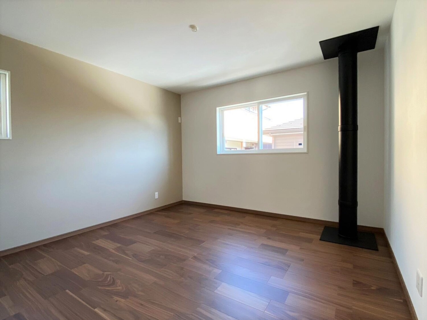 薪ストーブやオシャレな室内窓、フロアタイルなどを取り入れたこだわりのコーディネートです