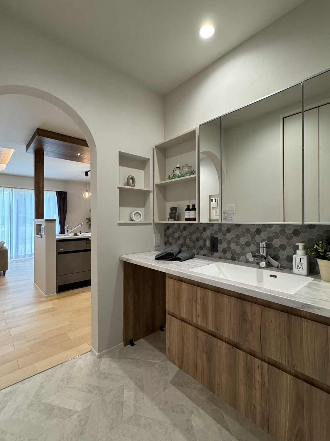 内装には天井高の変化やアーチ開口等、空間に立体感やアクセントを生み出す工夫を各所に施しました。
