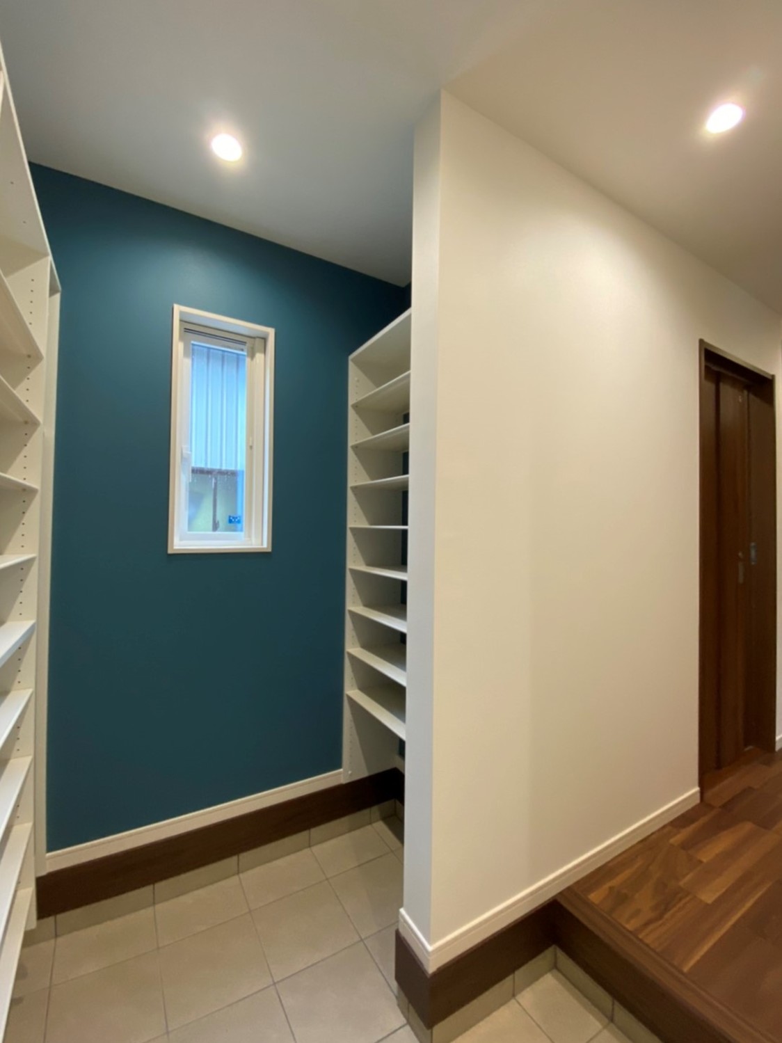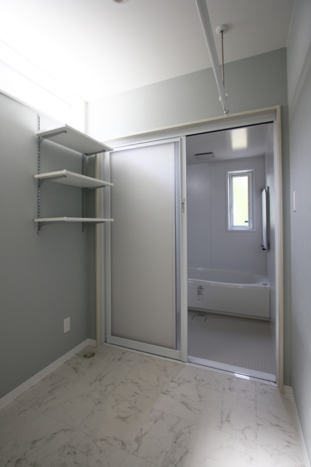 玄関ホールから一直線の洗面所はファミリークローゼットとしての機能も合わせ持っています。