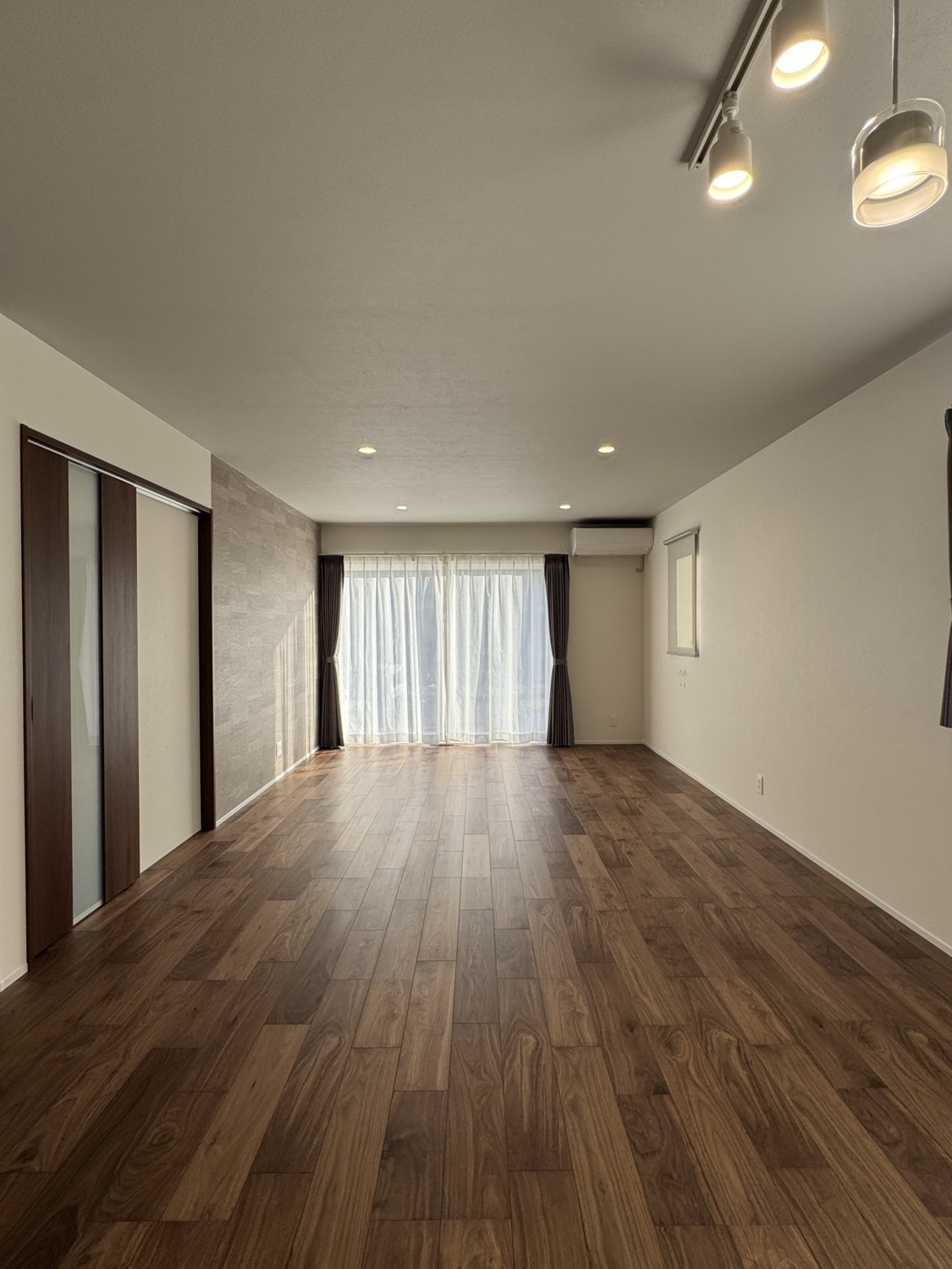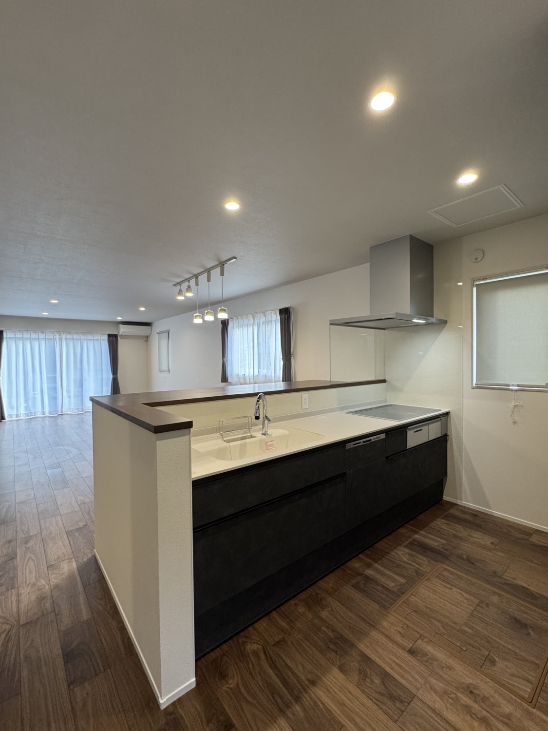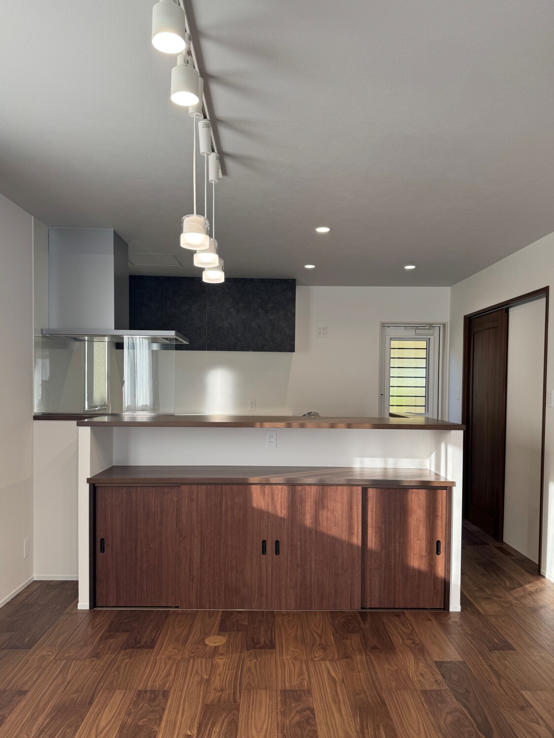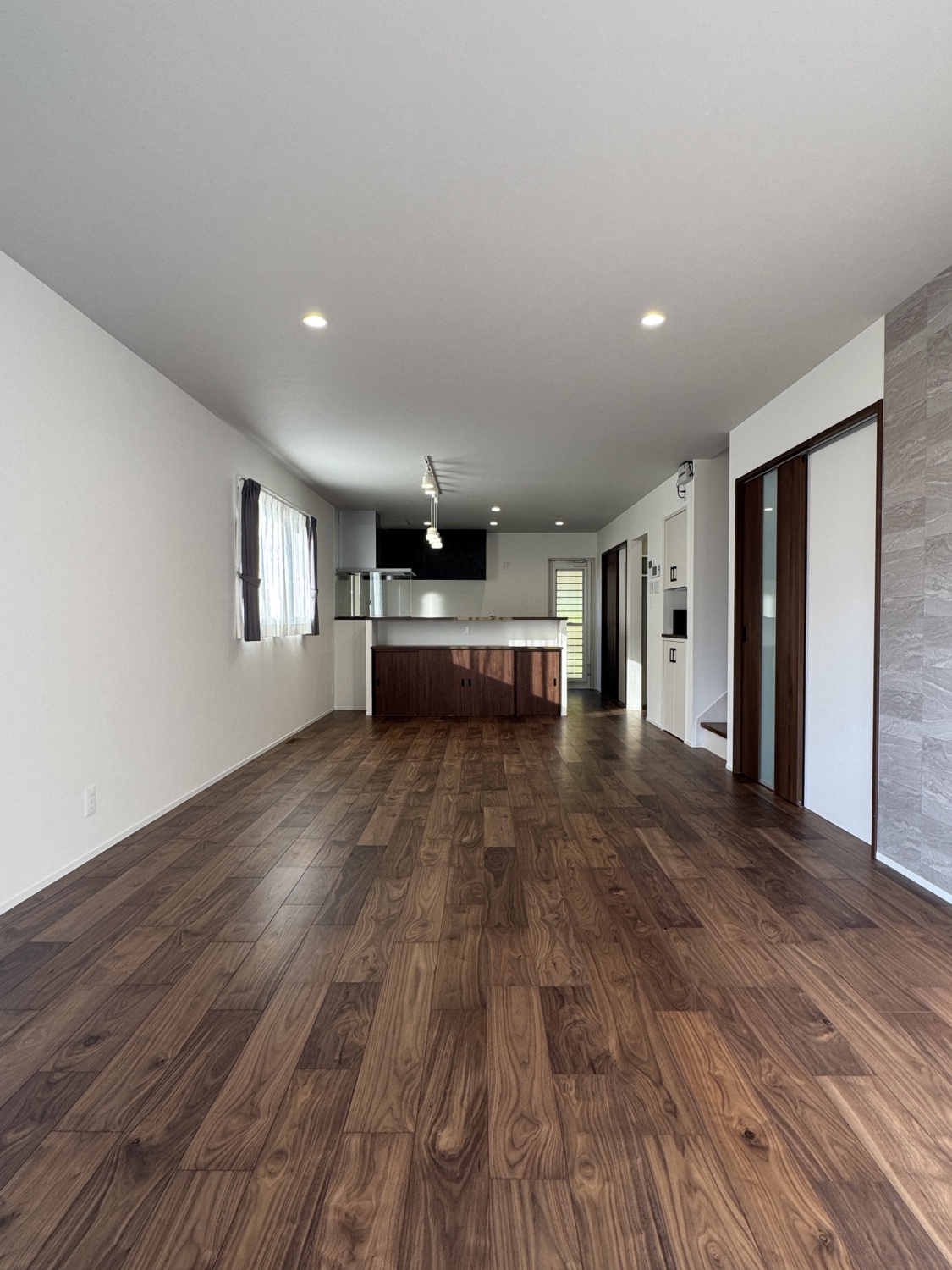 落ち着きのあるモダンな外観デザインと直線的な奥行きを活かした広々としたLDK。